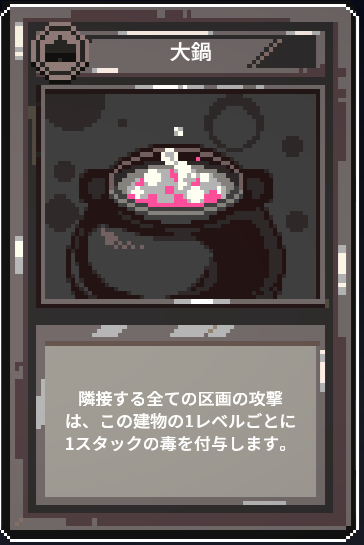全てのタイルの建物の火力をバフ出来る採石場、タイルを拡張しつつ配置転換できる土木工事、タワーを含む隣接ユニットにも毒付与できる大釜など他のカードと被らない独自の役割のカードを持つので楽しい。